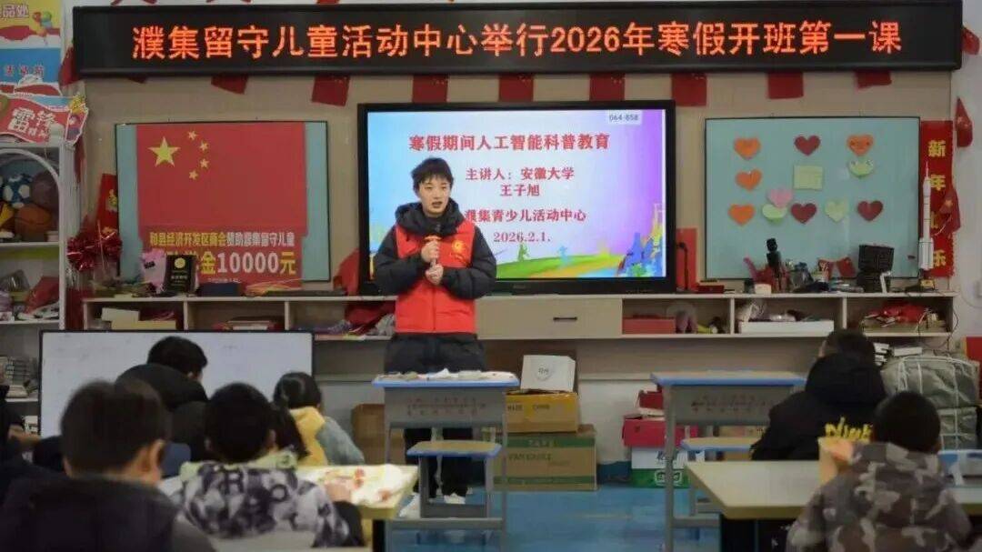近日,濮集留守儿童活动站2026寒假开班第一课开课,和县交警队杜昌来警官主讲交通、防火、网络安全,引导孩子学安全、传安全。大学生志愿者则带来AI入门知识与趣味数学分享。