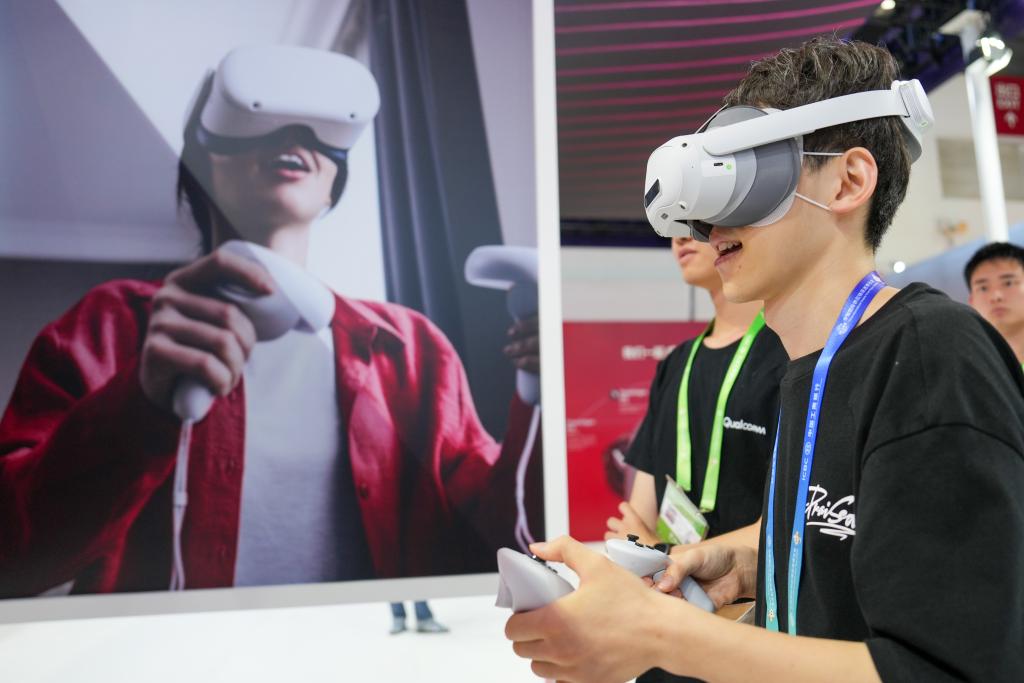 7月17日,参观者在数字科技链展区高通展台体验搭载了高通公司芯片的产品◇。新华社记者 鞠焕宗 摄